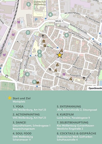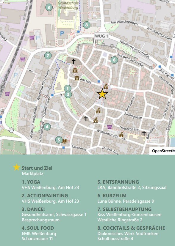 In Weißenburg starten alle 30 Minuten acht verschiedene Aktionen - kreativ, sportlich, entspannt oder richtig aktiv. Von Yoga, Tanzen und Actionpainting über Selbstbehauptung und Stressmanagement bis zu leckeren Snacks, Mocktails und einem kurzen Film.